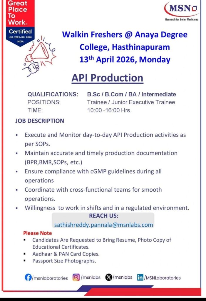 HomeHomeWalk-In – API Production Trainee (Freshers) – MSN Labs (Hasthinapuram) – April 13, 2026 – B.Sc / B.Com / BA / Intermediate Walk-In – API Production Trainee (Freshers) – MSN Labs (Hasthinapuram) – April 13, 2026 – B.Sc / B.Com / BA / Intermediate chandrakanth April 11, 2026 Post Views: 1 Related posts: Hiring Home Health Coding Experts: Team Lead, QA & Coder | Mumbai, Hyderabad, Chennai | Up to ₹15 LPA Patient Calling RCM Jobs in Chennai – Night Shift | 1–3 Years Experience | Immediate Joining HR Executive Job in Chennai & Madurai | Zaitoon Restaurants | ₹25k–₹30k | Hiring Now Remote Medical Coder – Freshers & Experienced – Trispect Health Medics (WFH, Night Shift, Training Provided) Share Pinterest Tweet Email Linkedin Whatsapp Telegram Prev Article Leave a Reply Cancel Reply Save my name, email, and website in this browser for the next time I comment.