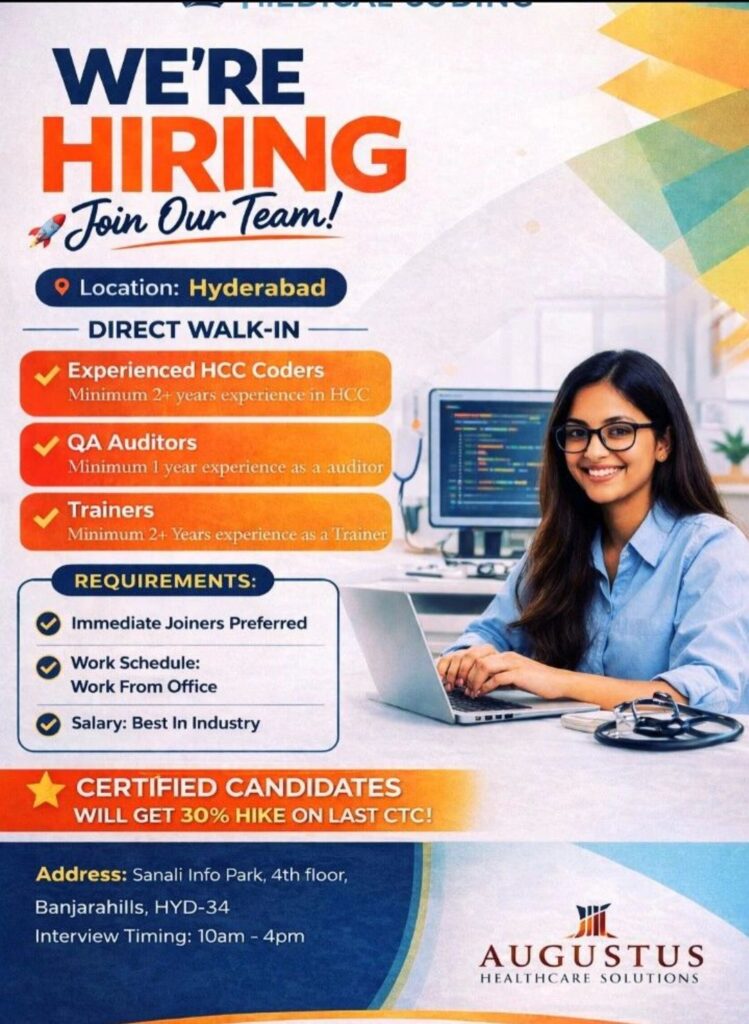 HomeHomeWalk-In Drive – HCC Coder, QA Auditor, Trainer – Augustus Healthcare (Hyderabad) – 1–3+ Yrs Exp – 30% Hike for Certified Walk-In Drive – HCC Coder, QA Auditor, Trainer – Augustus Healthcare (Hyderabad) – 1–3+ Yrs Exp – 30% Hike for Certified chandrakanth April 9, 2026 Post Views: 6 Related posts: SSterling Hospitals Hiring 2025 | Medical Officer, Staff Nurse & Assistant Manager Jobs AP కాంట్రాక్ట్ / అవుట్సోర్సింగ్ ఉద్యోగాలు 2025 | RMC Jobs Recruitment 2025 | అర్హత & దరఖాస్తు వివరాలు Sai Life Sciences Walk-In Interview 2026 | Analytical R&D (API) Jobs – Hyderabad Fresher Walk-in Interviews in Daman: B.Pharm, M.Sc, ITI, Diploma | USV Pharma Jobs – 18 Jan 2026 Share Pinterest Tweet Email Linkedin Whatsapp Telegram Prev Article Next Article Leave a Reply Cancel Reply Save my name, email, and website in this browser for the next time I comment.
