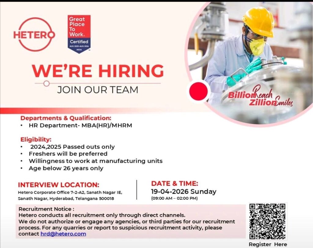 • Walk-In – HR Freshers (MBA/MHRM) – Hetero (Hyderabad) – 2024/2025 Passouts Only – Age Below 26 – April 19, 2026