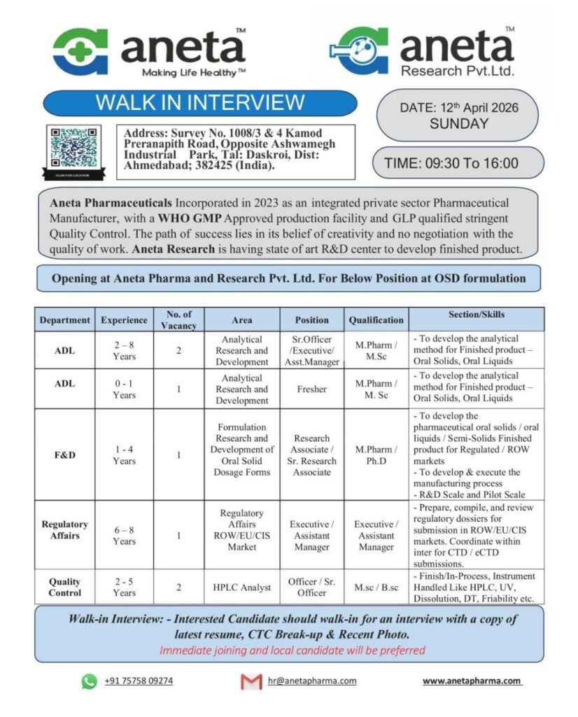HomeHomeWalk-In Interview @ Aneta Pharma | OSD Formulation Jobs (ADL, F&D, QA, QC) | Ahmedabad – 12 April 2026 Walk-In Interview @ Aneta Pharma | OSD Formulation Jobs (ADL, F&D, QA, QC) | Ahmedabad – 12 April 2026 chandrakanth April 8, 2026 Post Views: 2 Related posts: SSterling Hospitals Hiring 2025 | Medical Officer, Staff Nurse & Assistant Manager Jobs AP కాంట్రాక్ట్ / అవుట్సోర్సింగ్ ఉద్యోగాలు 2025 | RMC Jobs Recruitment 2025 | అర్హత & దరఖాస్తు వివరాలు Sai Life Sciences Walk-In Interview 2026 | Analytical R&D (API) Jobs – Hyderabad Fresher Walk-in Interviews in Daman: B.Pharm, M.Sc, ITI, Diploma | USV Pharma Jobs – 18 Jan 2026 Share Pinterest Tweet Email Linkedin Whatsapp Telegram Prev Article Next Article Leave a Reply Cancel Reply Save my name, email, and website in this browser for the next time I comment.