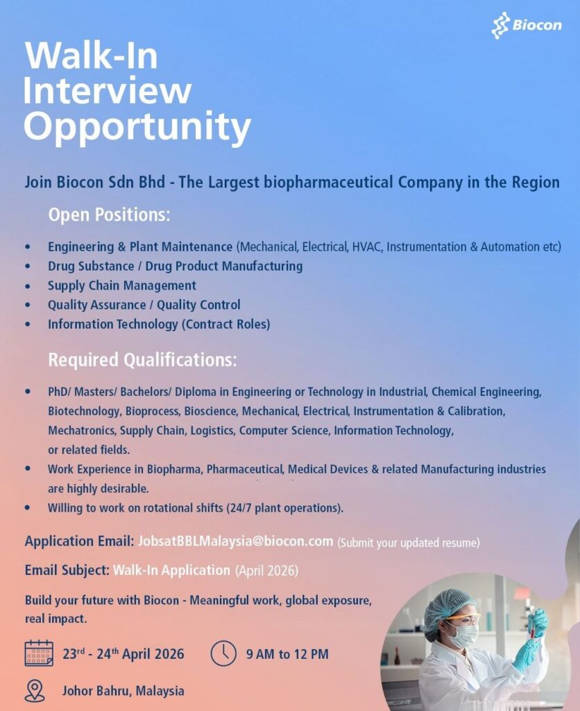 HomeHomeWalk-In Interview – Biocon Malaysia (Johor Bahru) – Engineering, Manufacturing, QA/QC, Supply Chain, IT – April 23-24, 2026 Walk-In Interview – Biocon Malaysia (Johor Bahru) – Engineering, Manufacturing, QA/QC, Supply Chain, IT – April 23-24, 2026 chandrakanth April 9, 2026 Post Views: 12 Related posts: SSterling Hospitals Hiring 2025 | Medical Officer, Staff Nurse & Assistant Manager Jobs AP కాంట్రాక్ట్ / అవుట్సోర్సింగ్ ఉద్యోగాలు 2025 | RMC Jobs Recruitment 2025 | అర్హత & దరఖాస్తు వివరాలు Sai Life Sciences Walk-In Interview 2026 | Analytical R&D (API) Jobs – Hyderabad Fresher Walk-in Interviews in Daman: B.Pharm, M.Sc, ITI, Diploma | USV Pharma Jobs – 18 Jan 2026 Share Pinterest Tweet Email Linkedin Whatsapp Telegram Prev Article Next Article Leave a Reply Cancel Reply Save my name, email, and website in this browser for the next time I comment.
