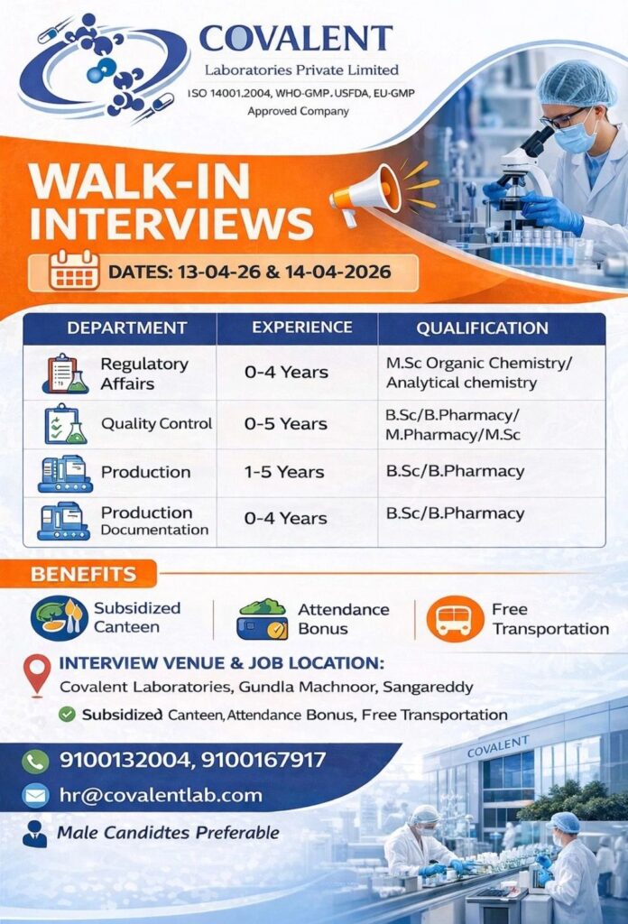 HomeHomeWalk-In Interview – Covalent Laboratories (Sangareddy) – Regulatory Affairs, QC, Production – 0–5 Yrs Exp – April 13-14, 2026 Walk-In Interview – Covalent Laboratories (Sangareddy) – Regulatory Affairs, QC, Production – 0–5 Yrs Exp – April 13-14, 2026 chandrakanth April 11, 2026 Post Views: 1 Related posts: Hiring Home Health Coding Experts: Team Lead, QA & Coder | Mumbai, Hyderabad, Chennai | Up to ₹15 LPA Patient Calling RCM Jobs in Chennai – Night Shift | 1–3 Years Experience | Immediate Joining HR Executive Job in Chennai & Madurai | Zaitoon Restaurants | ₹25k–₹30k | Hiring Now Remote Medical Coder – Freshers & Experienced – Trispect Health Medics (WFH, Night Shift, Training Provided) Share Pinterest Tweet Email Linkedin Whatsapp Telegram Prev Article Next Article Leave a Reply Cancel Reply Save my name, email, and website in this browser for the next time I comment.