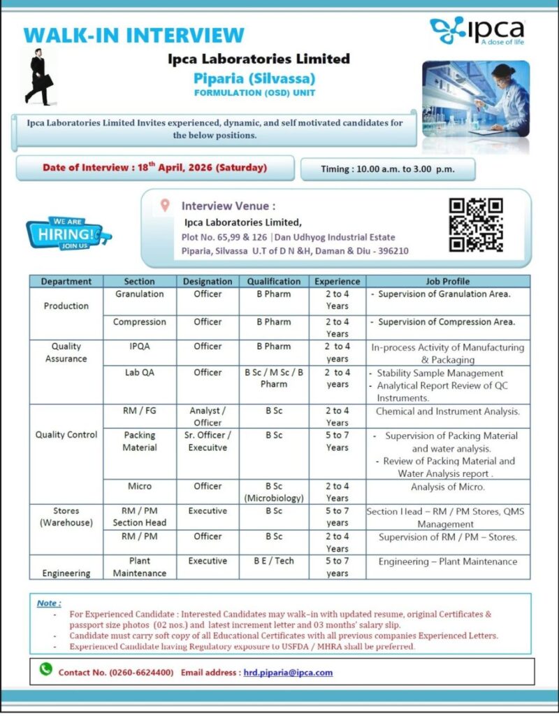 HomeHomeWalk-In Interview @ Ipca Laboratories (Silvassa) – OSD Formulation Unit | 18th April 2026 Walk-In Interview @ Ipca Laboratories (Silvassa) – OSD Formulation Unit | 18th April 2026 chandrakanth April 4, 2026 Post Views: 5 Related posts: SSterling Hospitals Hiring 2025 | Medical Officer, Staff Nurse & Assistant Manager Jobs AP కాంట్రాక్ట్ / అవుట్సోర్సింగ్ ఉద్యోగాలు 2025 | RMC Jobs Recruitment 2025 | అర్హత & దరఖాస్తు వివరాలు Sai Life Sciences Walk-In Interview 2026 | Analytical R&D (API) Jobs – Hyderabad Fresher Walk-in Interviews in Daman: B.Pharm, M.Sc, ITI, Diploma | USV Pharma Jobs – 18 Jan 2026 Share Pinterest Tweet Email Linkedin Whatsapp Telegram Prev Article Next Article Leave a Reply Cancel Reply Save my name, email, and website in this browser for the next time I comment.
