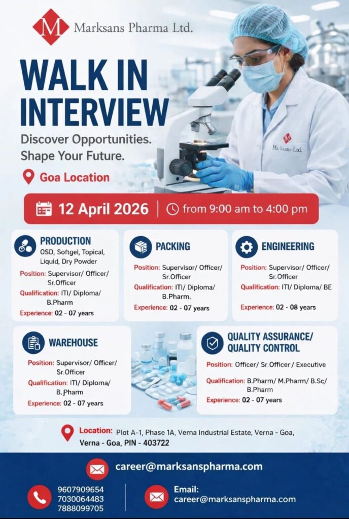 • Walk-In Interview – Marksans Pharma Goa (Production, Packing, Engineering, Warehouse, QA/QC) – April 12, 2026 – 2–8 Yrs Exp