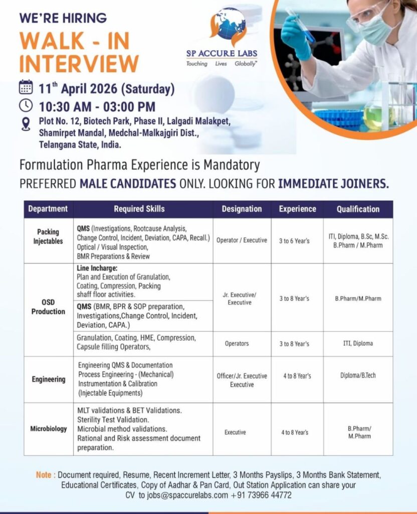 Walk-In Interview – Spaccure Lab (Shamirpet, Hyderabad) – Injectables Packing, OSD Production, Engineering, Microbiology – April 11, 2026