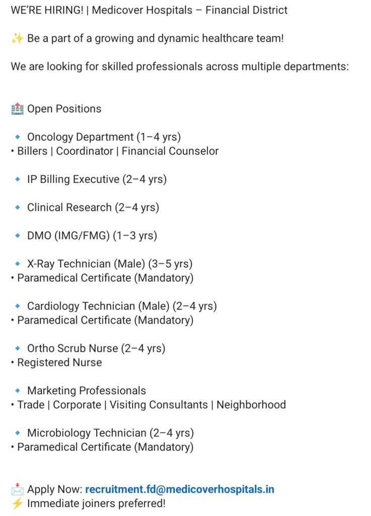 HomeHomeWalk-In – Oncology, IP Billing, Clinical Research, DMO, X-Ray, Cardiology, Ortho Scrub Nurse, Marketing – Medicover (Financial District) Walk-In – Oncology, IP Billing, Clinical Research, DMO, X-Ray, Cardiology, Ortho Scrub Nurse, Marketing – Medicover (Financial District) chandrakanth April 12, 2026 Post Views: 4 Related posts: Hiring Home Health Coding Experts: Team Lead, QA & Coder | Mumbai, Hyderabad, Chennai | Up to ₹15 LPA Patient Calling RCM Jobs in Chennai – Night Shift | 1–3 Years Experience | Immediate Joining HR Executive Job in Chennai & Madurai | Zaitoon Restaurants | ₹25k–₹30k | Hiring Now Remote Medical Coder – Freshers & Experienced – Trispect Health Medics (WFH, Night Shift, Training Provided) Share Pinterest Tweet Email Linkedin Whatsapp Telegram Prev Article Next Article Leave a Reply Cancel Reply Save my name, email, and website in this browser for the next time I comment.