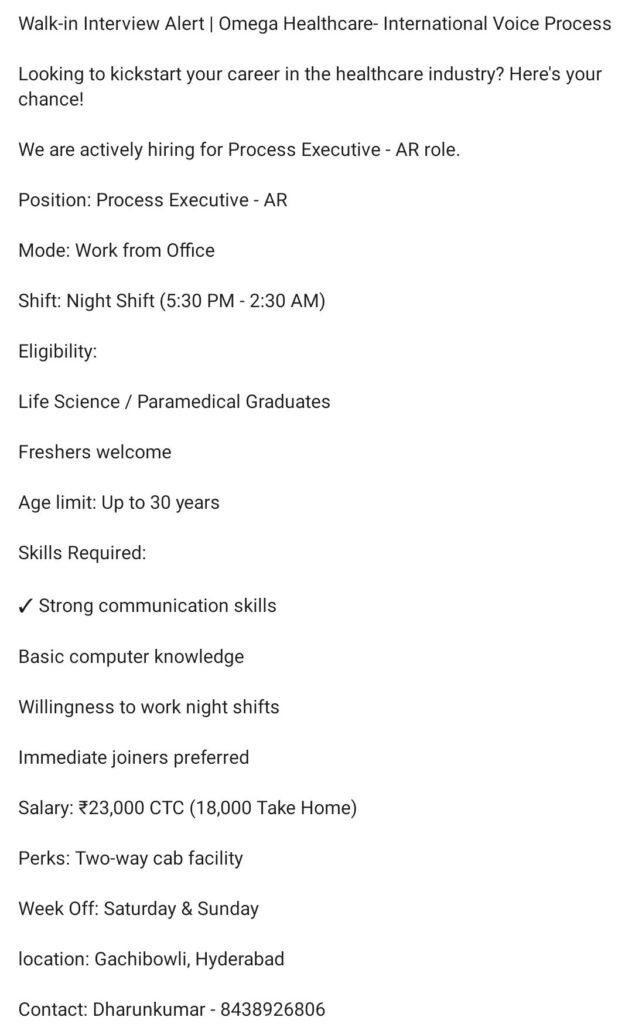 HomeHomeWalk-In – Process Executive AR (Fresher) – Omega Healthcare (Hyderabad, Gachibowli) – Night Shift, ₹23K CTC, Sat-Sun Off, Cab Walk-In – Process Executive AR (Fresher) – Omega Healthcare (Hyderabad, Gachibowli) – Night Shift, ₹23K CTC, Sat-Sun Off, Cab chandrakanth April 17, 2026 Post Views: 1 Related posts: SSterling Hospitals Hiring 2025 | Medical Officer, Staff Nurse & Assistant Manager Jobs AP కాంట్రాక్ట్ / అవుట్సోర్సింగ్ ఉద్యోగాలు 2025 | RMC Jobs Recruitment 2025 | అర్హత & దరఖాస్తు వివరాలు Sai Life Sciences Walk-In Interview 2026 | Analytical R&D (API) Jobs – Hyderabad Fresher Walk-in Interviews in Daman: B.Pharm, M.Sc, ITI, Diploma | USV Pharma Jobs – 18 Jan 2026 Share Pinterest Tweet Email Linkedin Whatsapp Telegram Prev Article Next Article Leave a Reply Cancel Reply Save my name, email, and website in this browser for the next time I comment.