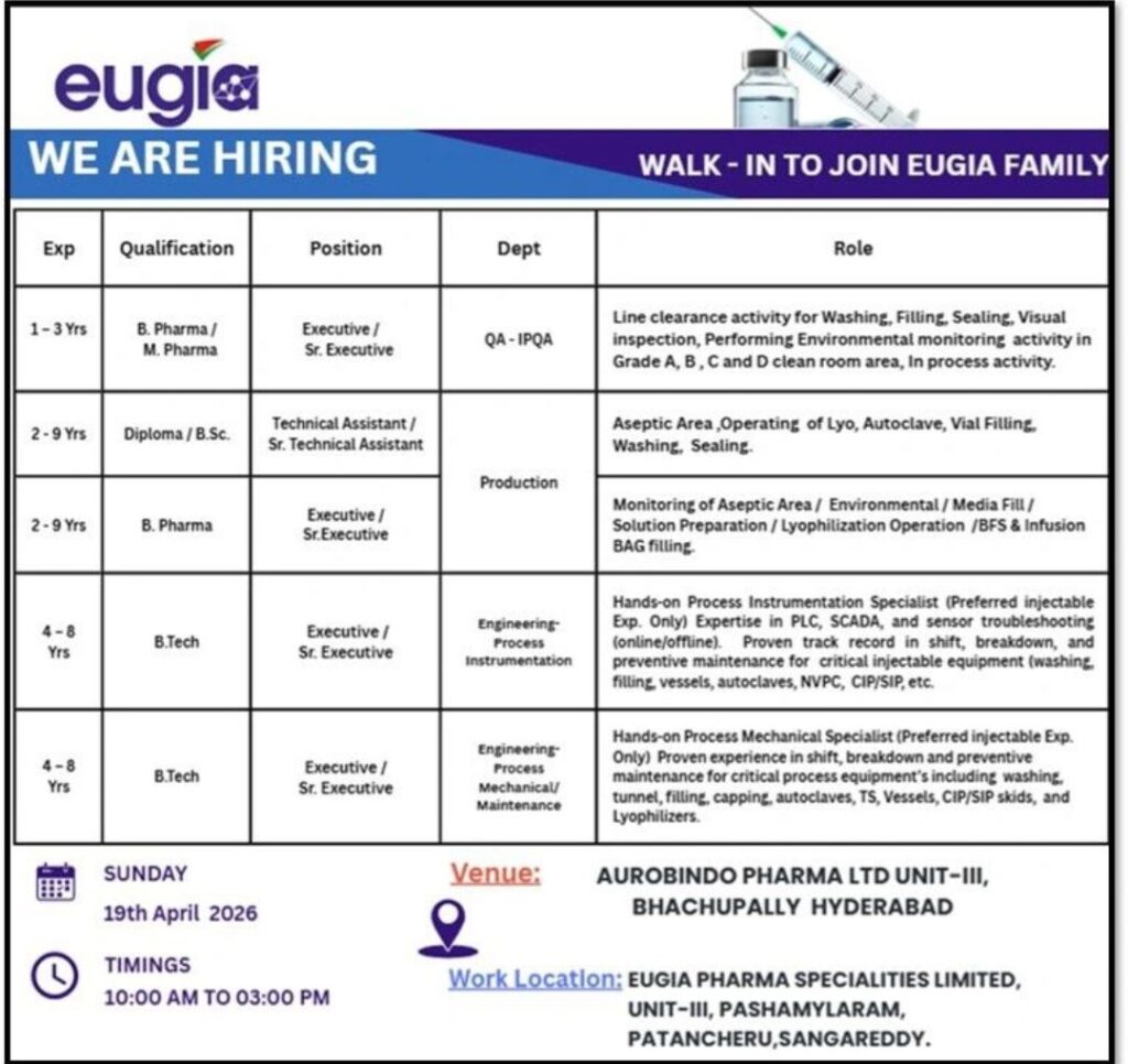 Walk-In – QA, Production, Engineering (Injectable) – Eugia Pharma (Hyderabad) – 1–9 Yrs Exp – April 19, 2026