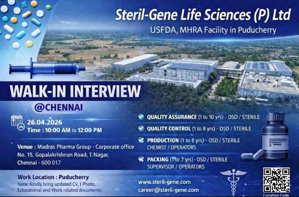 HomeHomeWalk-In – QA, QC, Production, Packing (OSD/Sterile) – Steril-Gene (Chennai) – 1–10 Years Exp – Work Location Puducherry – April 26, 2026 Walk-In – QA, QC, Production, Packing (OSD/Sterile) – Steril-Gene (Chennai) – 1–10 Years Exp – Work Location Puducherry – April 26, 2026 chandrakanth April 20, 2026 Post Views: 1 Related posts: SSterling Hospitals Hiring 2025 | Medical Officer, Staff Nurse & Assistant Manager Jobs AP కాంట్రాక్ట్ / అవుట్సోర్సింగ్ ఉద్యోగాలు 2025 | RMC Jobs Recruitment 2025 | అర్హత & దరఖాస్తు వివరాలు Sai Life Sciences Walk-In Interview 2026 | Analytical R&D (API) Jobs – Hyderabad Fresher Walk-in Interviews in Daman: B.Pharm, M.Sc, ITI, Diploma | USV Pharma Jobs – 18 Jan 2026 Share Pinterest Tweet Email Linkedin Whatsapp Telegram Prev Article Next Article Leave a Reply Cancel Reply Save my name, email, and website in this browser for the next time I comment.
