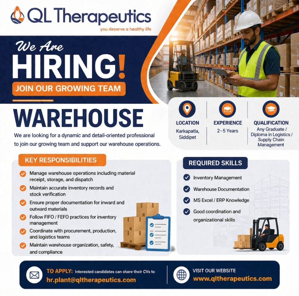 HomeHomeWarehouse Executive – QL Therapeutics (Karkapatla, Siddipet) – 2–5 Yrs Exp – Any Graduate/Diploma in Logistics Warehouse Executive – QL Therapeutics (Karkapatla, Siddipet) – 2–5 Yrs Exp – Any Graduate/Diploma in Logistics chandrakanth April 8, 2026 Post Views: 1 Related posts: SSterling Hospitals Hiring 2025 | Medical Officer, Staff Nurse & Assistant Manager Jobs AP కాంట్రాక్ట్ / అవుట్సోర్సింగ్ ఉద్యోగాలు 2025 | RMC Jobs Recruitment 2025 | అర్హత & దరఖాస్తు వివరాలు Sai Life Sciences Walk-In Interview 2026 | Analytical R&D (API) Jobs – Hyderabad Fresher Walk-in Interviews in Daman: B.Pharm, M.Sc, ITI, Diploma | USV Pharma Jobs – 18 Jan 2026 Share Pinterest Tweet Email Linkedin Whatsapp Telegram Prev Article Next Article Leave a Reply Cancel Reply Save my name, email, and website in this browser for the next time I comment.
